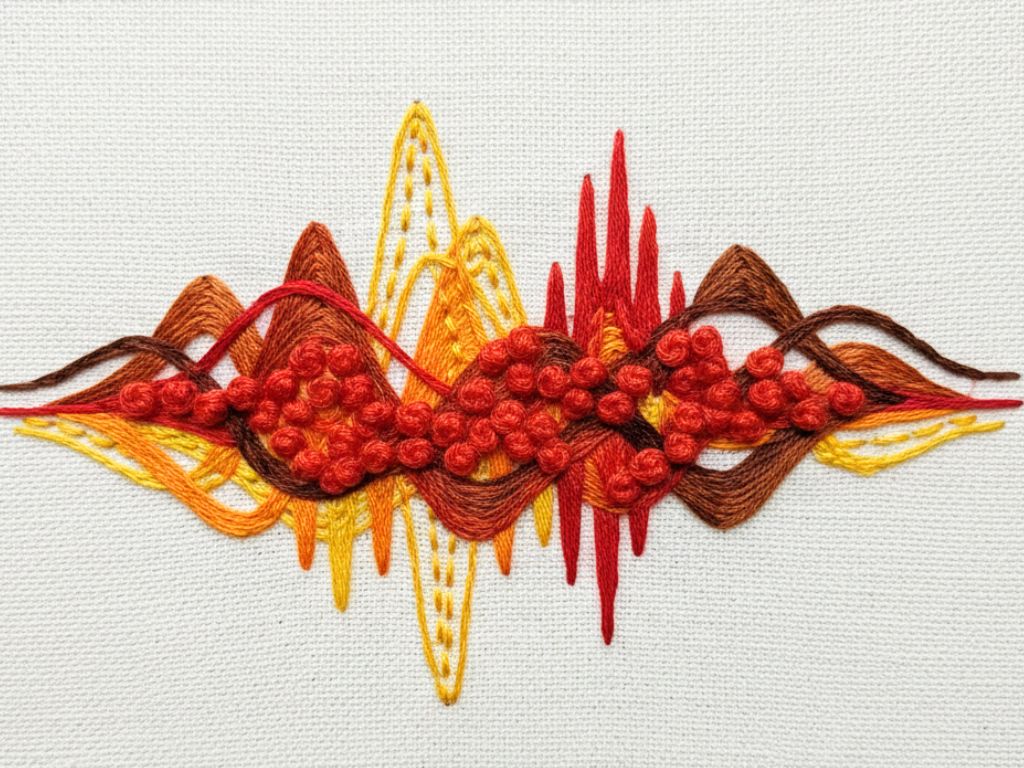 Textilní umění nabízí jiný typ vizualizace: pomalý, hmatatelný, časově náročný. Výšivka pracuje se stejnými principy jako zvuk - rytmem, opakováním, strukturou, vrstvami. Každý steh je jednotkou času. Hustota stehů může odpovídat intenzitě. Směr, délka a zakřivení linky pak mohou přímo navazovat na tvar zvukové vlny.