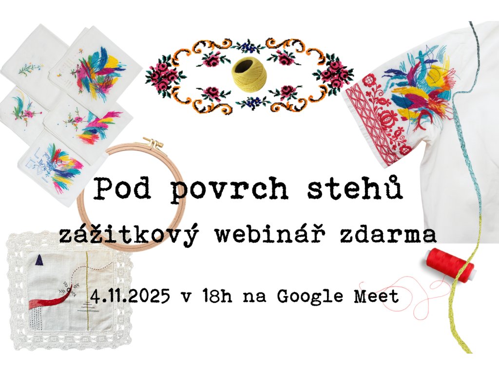 Webinář bude mít dvě části. V první, teoretické části si ukážeme inspirace a příklady z moderního i současného textilního umění, kde autoři a autorky výšivku pojímají jako prostředek k navázání na historii, kolektivní paměť či rodinné předky. V druhé, praktické části se sami pokusíme o kreativní zásah do starší výšivky. Vše bude probíhat uvolněnou zábavnou formou.