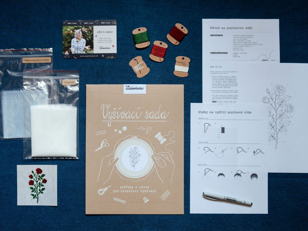 Všechno co potřebujete pro vyšívání popínavé růže, včetně šablony na překreslení a pečlivě vybraných vyšívacích přízí.