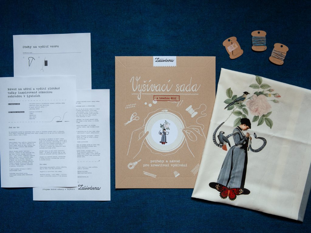 Všechno co potřebujete pro ušití a vyšití plátěné tašky s potiskem inspirovaným zámeckou zahradou v Lysicích.