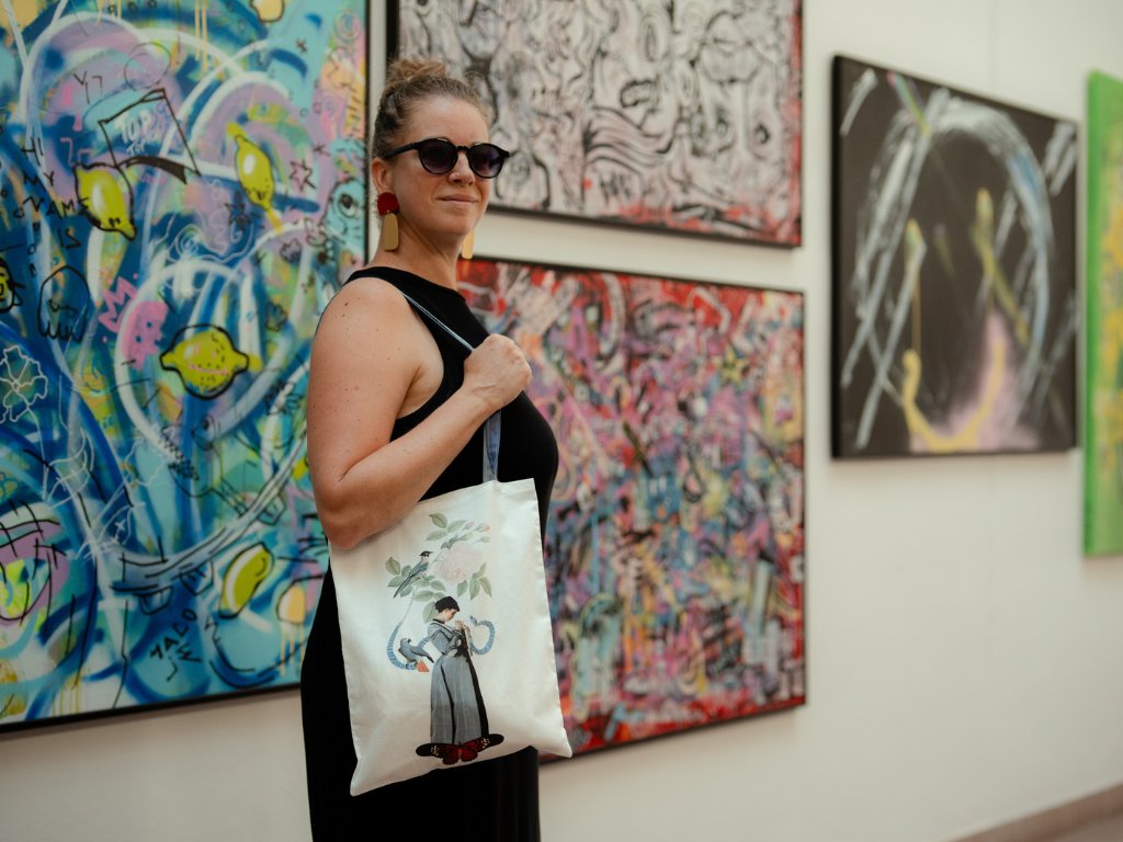 Vyšívací a šicí sada na výrobu plátěné tašky s potiskem.